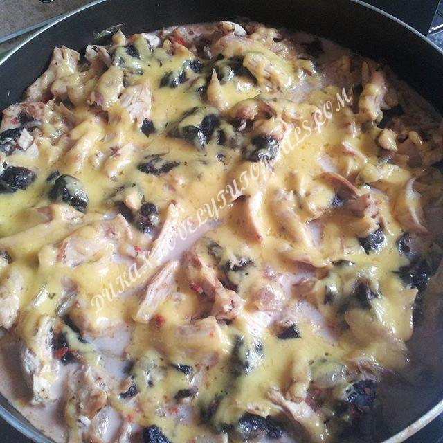 отварную курицу порвала на крупные куски, грибы обжарила с луком, перемешать курицу с грибами. Выложила в сковороду, сверху полила соусом (классический йогурт, молоко, аджика, соль) и немного сыра (на тёрке). В духовку минут на 20 Автор-yulia_na_dukane |