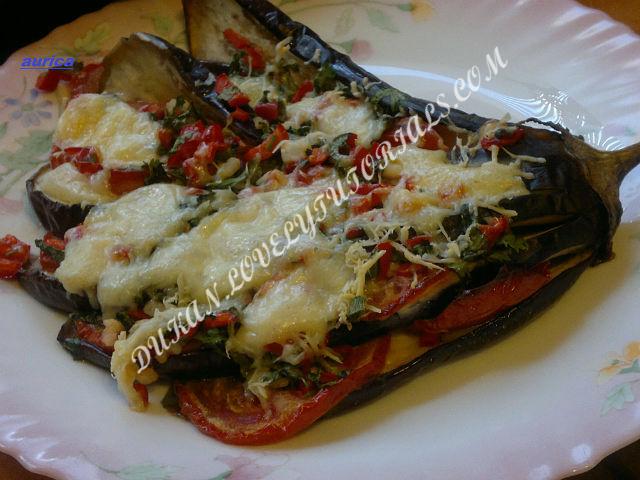 Не отделяя от основания, разрезать баклажаны вдоль на 1/2 см. ломтики. Можно даже не отрезать хвостики.Баклажан посолить и оставить на 30 мин,затем промыть,обсушить бумажным полотенцем ,в каждый надрез положить по дольке помидора и смазать натуральным йогуртом,убрать в духовку на 20 мин при 200гр.Отдельно мелко нарезать пучок кинзы(или др зелени),красный(или др цвета)сладкий перец ,3-4 зубчика чеснока ,все перемешать ,посолить и выложить сверху на баклажаны,посыпать маложирным сыром и еще запекать 10 мин.Приятного аппетита!!! источник:Аурика В |