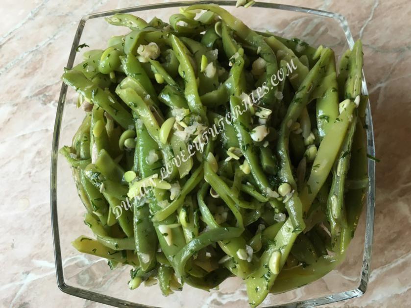 Фасоль промыть, обрезать хвостики.Разрезать вдоль на 2 части, положить в кастрюлю, налить немного кипяченной воды, чтобы покрывала дно кастрюли. Добавить соль, накрыть крышкой и варить до готовности (5-7минут). Фасоль не надо разваривать, должна хрустеть. Откинуть фасоль на дуршлаг.Дать немного остыть, потом добавить уксус, чеснок, мелко нарезанный укроп. Аккуратно перемешать снизу вверх лопаткой, накрыть крышкой и убрать в холодильник на пару часов. |