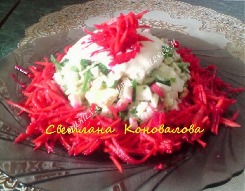Вложение 417 Краб.палочки, свежий огурец, редька на кр.терке, яйцо вареное, лук зеленый, петрушка, 1-2 зуб.чеснока, морковка остренькая маринованная, майонез. Майонез: взбивать погружным блендером 3 сырых яйца+ 1 ч.л. готовой горчицы+ соль+ сахзам+ мол.перец около 1 мин. Далее тонкой струйкой вливать раст. масло (всего около 100 мл), продолжать взбивать, пока масса не загустеет, в конце добавить несколько капель лим.сока и перемешать. Готовый майонез хранить в стекле, в холодильнике. Использовать по норме масла в день. |