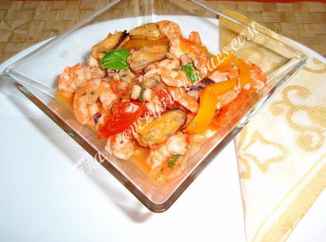 На дно сотейника влить 1 коф ложку оливкого масла(это не много,не бойтесь,в готовом блюде-порции,даже и 3-х капель не будетhttps://st.mycdn.me/res/i/t.gif,когда масло прогреется выдавливаем в него 1 зубчик чеснока и перемешиваем,как только чеснок начнет отдавать аромат,то сразу же выкладываем лук порезанный кубиками-1 шт,перец сладкий,порезанный полосками-1 шт и 3-4 томата,порезанных дольками.Все перемешали и накрыли крышкой,пусть овощи томятся в собственном соку минут 10.Затем добавляем 1 стакан кипятка,травы Прованса(Средиземноморски )и выкладываем морепродукты.Я брала креветки 2-х сортов,мидии,маленьких осминогов и мясо кальмара.Можно использовать и замороженные смеси(вкус не страдает,я пробовала на Украине,но креветок нужно добавить будет тогда)И тушим все еще 10 мин,до готовности.Выключили огонь,открыли крышку и посыпаем свежими листьми базилика.Ну и приятного всем апппетита! источник:я я |