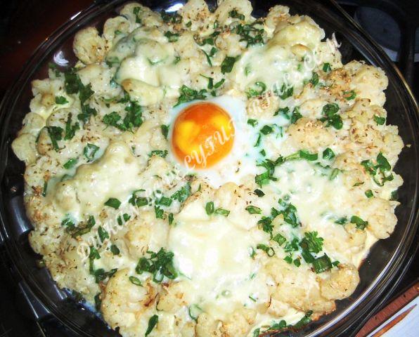 1 вилок цветной капусты,2 яйца и 2 белка,50 гр безжиренных сливок,1 ч л отрубей,пучек зеленого лука,укроп,петрушка и 5 ломтиков моцареллы(обезжиренной,каж ется там всего 4 % жира) Капусту отварила в подсоленной воде минут 10-15.Охладила.Приготовила заливку:смешала 2 белка и 1 яйцо,соль,сливки и отруби и залила смесью подготовленную в форме капусту,посыпала зеленью,разбила на середину сырое яйцо и по краям выложила моцареллу.Запекать при 200 гр,15 мин источник:я я |
