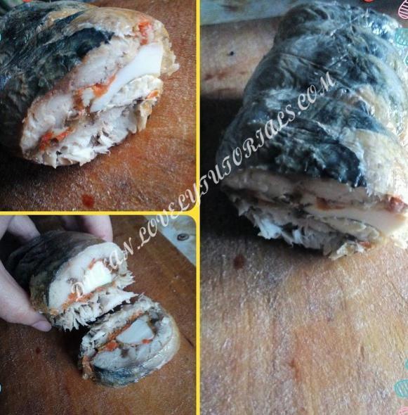 Вложение 426 Через СПИНКУ достать косточки, сложить две тушки, хвостик к голове. Посолить поперчить, плюс 20гр. желатина посыпать по филе. Потом слой морковки на терку ( вареной или жареной) , вареное яйцо, можно на терку, можно четвертинки.После того, как сформируете рулетик в пленке и обвяжете, вирить в кипящей воде минут 15. Остудить и под легкий пресс на холод. Режется на аккуратные ломтики. |