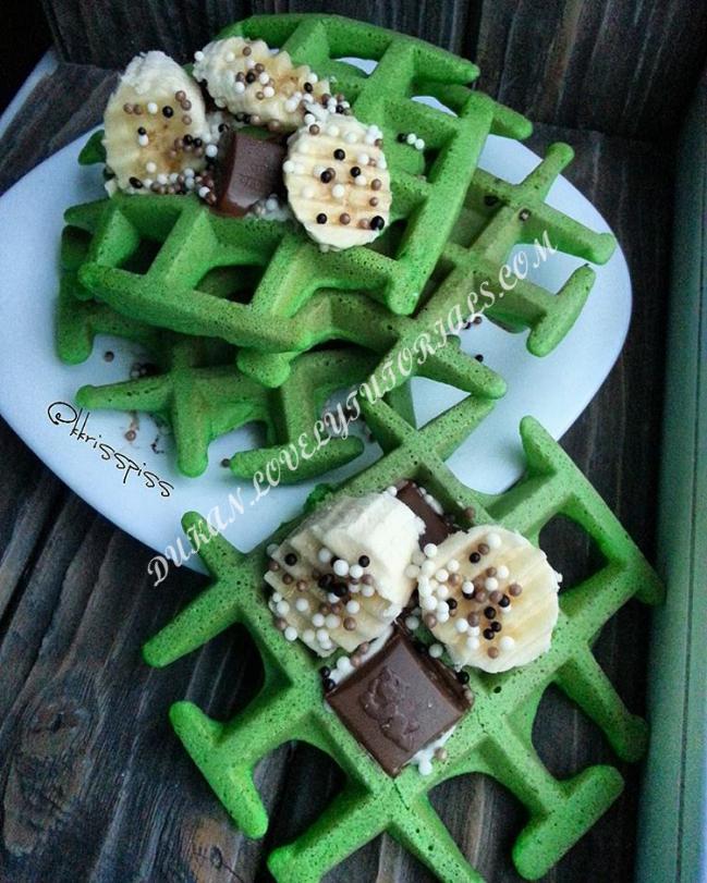 Пучок свежего шпината(пюрируем погружным блендером) 1яйцо 100мл молока 100гр муки(может понадобится чуть больше, добиваемся консистенции густой сметаны) Разрыхлитель, ваниль и сахзам Всё смешиваем и выпекаем в вафельнице источник:kkrisspiss |