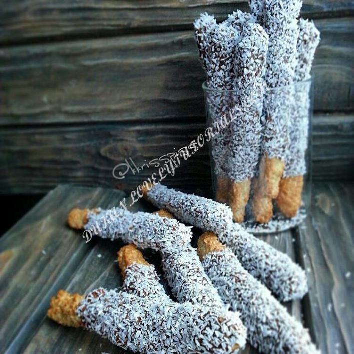 2 яйца Молоко 100мл Стружка кокос.20гр Геркулес 220гр Фундук/миндаль/кешью всё по 20гр Сахзам по вкусу 1 желток Геркулес и орехи мелем в муку грубого помола.Все ингредиенты, кроме желтка смешиваем. Должно получиться густое и тугое тесто. Даем постоять минут 15-20. Греем духовку до 200° Создаем форму палочек укладываем их на пергамент, мажем желтком (его можно развести с небольшим количеством воды) Отправляем в духовку на 20-30 минут до золотой корочки 20-30 Топим горький шоколад, обмазываем кисточкой палочку и присыпаем кокосовой стружкой, можно орехами Приятного аппетита и хорошего продуктивного дня источник:kkrisspiss |