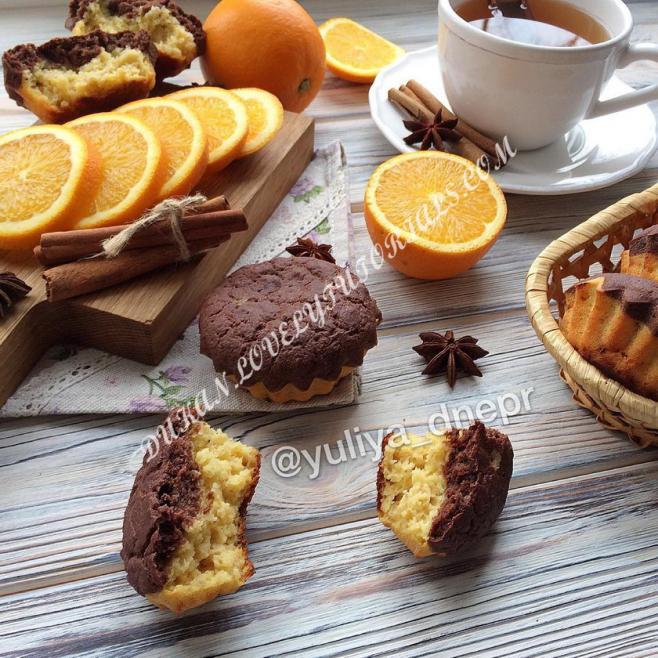 КБЖУ на 100 гр. 170/4.7/4.6/27🔸 🔹Ингредиенты: -1 банан -1 яйцо -150 мл.ряженки -20 гр.сливочного масла -100 мл свежевыжатого апельсинового сока -80 гр.кукурузной муки -80 гр.рисовой муки -0,5 ст.ложки какао -5 гр.разрыхлителя 🔹Приготовление: Банан разминаем вилкой, добавляем яйцо, растопленное масло, ряженку, апельсиновый сок (выдавливаем из 1 большого апельсина). В другой ёмкости соединяем муку и разрыхлитель, просеиваем к жидким ингредиентам. Должна получится консистенция как не густая сметана. Наполняем до половины формочки (у меня силиконовые). В оставшуюся часть теста кладём какао, размешиваем и доливаем в формочки. Ставим в разогретую духовку на 180 гр, через 20 мин убавляем температуру и оставляем ещё на 5 мин. Сразу не достаём, даём чуть остыть в духовке. Получаются очень ароматные и мягкие кексы 👌🏻 Обязательно попробуйте! источник: yuliya_dnepr |