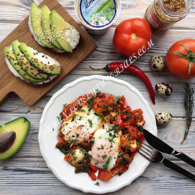На смазанную маслом сковородку выкладываю порезанные помидоры, болгарский перец (у меня из заморозки), через пару минут заливаю овощи соусом 0,5 ст.ложки томатной пасты + 1/4 стакана воды, немного тушу под крышкой. Далее можно добавить зубок чеснока, выдавленного через пресс (но это для самых смелых😅) Если нам ещё предстоят встречи с людьми этот пункт пропускаем)) В овощной смеси с томатом делаем углубления, в них вбиваем яйца, накрываем крышкой. Как только белок сверху "схватится" выключаем, присыпаем зеленью ☘️ Шакшука готова 👌🏻 КБЖУ порции 390 ккал, на 100 гр. 80/5.2/4.8/3.7 источник: yuliya_dnepr |