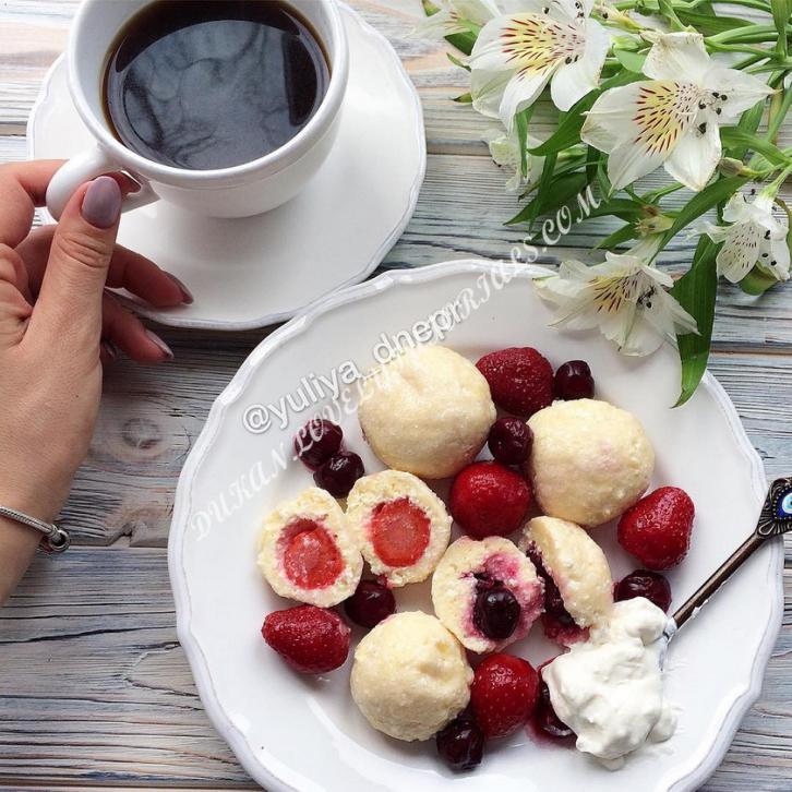 Ленивые вареники с клубникой и вишней🍓🍒 🔹КБЖУ всей порции 346 ккал. на 100 гр. 144/12.9/5.8/9.6🔹 ⚜️Ингредиенты (на 1 порцию): -150 гр.творога домашнего (можно пастообразный в пачках 5%) -1 желток -1 ст.ложка рисовой муки без горки -ванилин -ягоды для начинки (у меня замороженная клубника и вишня) ⚜️Творог хорошо перетираем (лучше это сделать через сито), добавляем желток, ложку муки, щепотку валилина. Хорошо размешиваем. Получается эластичная масса, которую легко лепить. Ложкой набираем "тесто", делаем углубление, кладём внутрь по 1 клубничке среднего размера или по 3 вишенки (можно по 1 шт), аккуратно защипываем края и ладошками формируем шарик. Бросаем в закипевшую воду, когда всплывут держим ещё 1-2 мин, достаём шумовкой. Выкладываем в тарелочку, добавляем сметанку) Наслаждаемся источник: yuliya_dnepr |