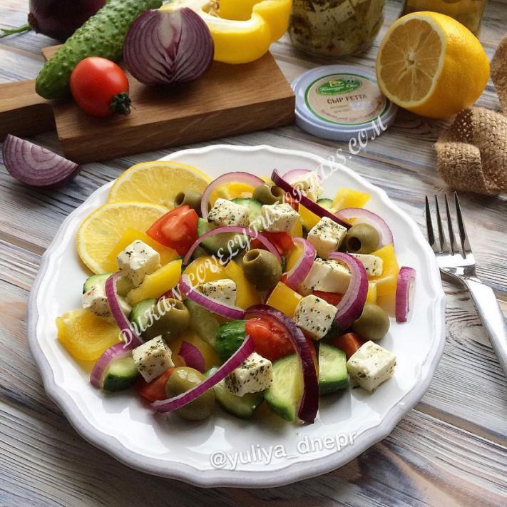 КБЖУ на 100 гр.77.7/2.9/5/3.8🔸 Ингредиенты: -болгарский перец -помидоры -огурцы -маслины (оливки) -салатный лук -сыр фета, замаринованный в специях и оливковом масле 👌🏻 -оливковое масло -сок лимона Готовить салат проще простого: овощи помыли, порезали крупными кусочками, добавили горсточку оливок (маслин), сверху выложили нарезанную кубиками фету. В качестве заправки сбрызгиваем овощи оливковым маслом и соком лимона. Если используете фету замаринованную, как у меня, дополнительно масло не потребуется, достаточно того, что с феты. Вкусный ужин готов источник: yuliya_dnepr |