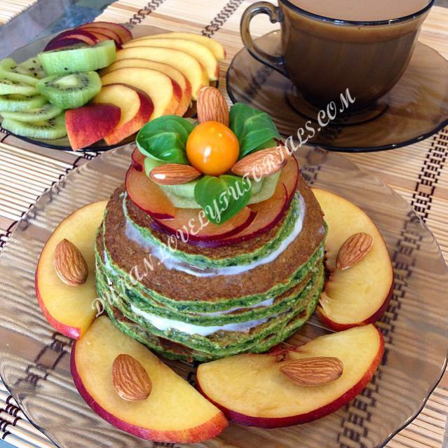 🔸100 гр. замороженного шпината взбить в блендере в пюре 🔸1 чашку овсяных хлопьев смолоть в муку в блендере 🔸2 яйца 🔸100 мл. молока 🔸1-2 ч.л. меда 🔸2 ст.л. кукурузной муки / либо любой другой 🔸1 ч.л. разрыхлителя 🔸все ингредиенты смешиваем, тесто должно быть гуще чем на оладьи 🔸жарим панкейки на сухой сковороде 🔸прослаиваем соусом и украшаем Приятного аппетита!!! источник:belyaeva_el |