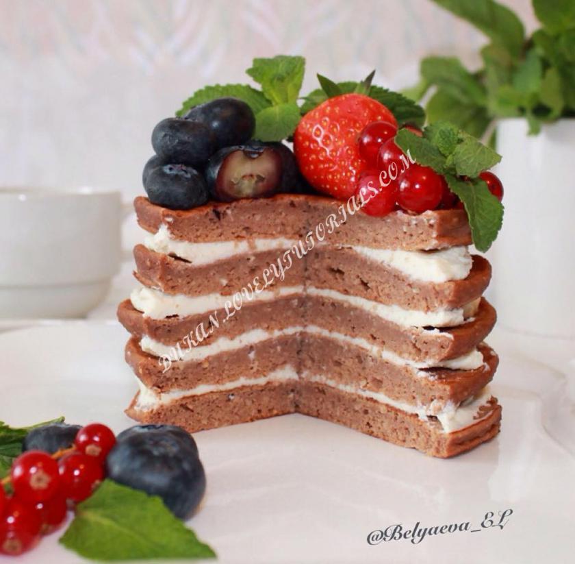 Для приготовления необходимо: 🔸1 банан 🔸100 мл. кефира 🔸2 яйца 🔸4 ст.л. гречневой муки 🔸2 ст.л. перемолотой овсянки 🔸1 ст.л. какао 🔸2 ч.л. мёда 🔸1 ч.л. разрыхлителя Банан, мёд, какао и кефир взбиваем в блендере. Отдельно взбиваем яйца. Все соединяем. Всыпаем овсянку, гречневую муку и разрыхлитель, смешиваем венчиком. Выпекаем на сковороде без масла на среднем огне. Для крема: 🔸150 гр. рикотты 🔸150 гр. творога 🔸2 ч.л. мёда Взбиваем все ингредиенты в блендере до кремовой консистенции. Собираем торт, смазывая каждый панкейк кремом. Украшаем ягодами. Приятного аппетита! источник:belyaeva_el |