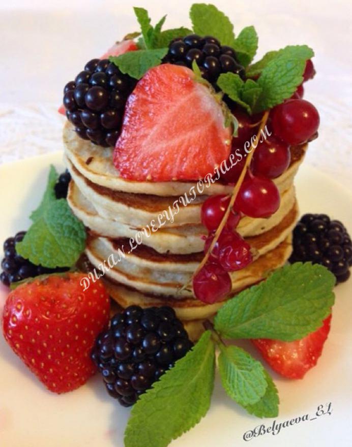 банановые панкейки с ягодами клубники, ежевики, красной смородины
