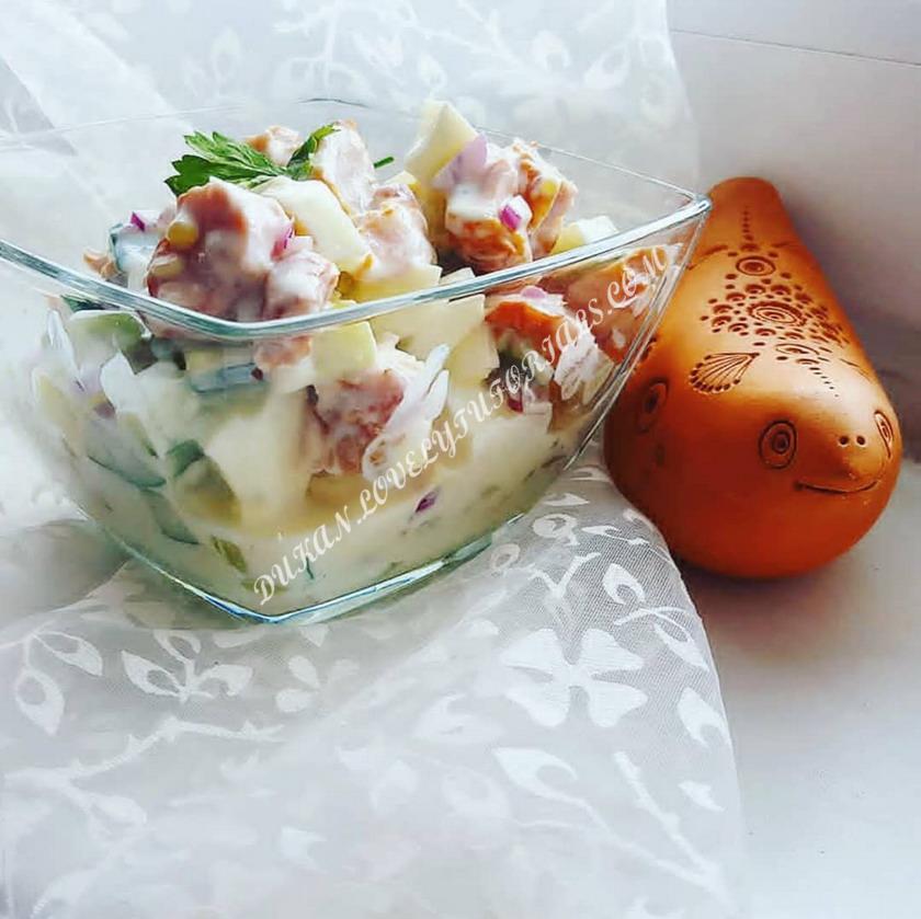 Копченая курочка Отварные яйца Лук репчатый Соленый огурчик Зелень Заправка из йогурта+горчица+лимонный сок+ желток источник:aglaya_dukan |