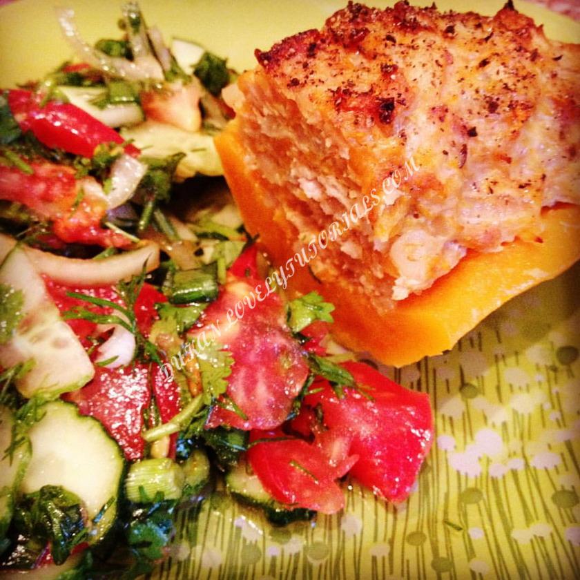 Берём тыкву примерно 700 г весом, режем пополам, удаляем семена и выбираем ложкой мякоть, делая ровное углубление по всей длине. Чистим, солим и фаршируем. У меня 3 куриных бёдра, перемолотых в блендере с мякотью тыквы, плюс мелко порезанный и помятый с солью лук. Ну и специи по вкусу. Пекла 1,5 часа при 180 градусах. источник: Оксана Титевалова |