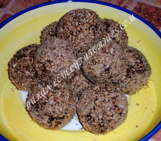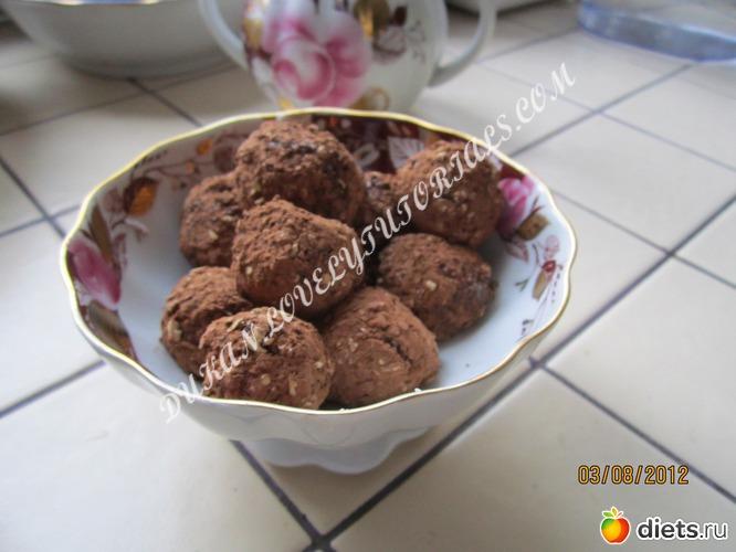 Фото-ОЛЬГА 174 БОРИСОВА Вложение 487 Готовим с вечера: берем 4 ст.л. овсяных отрубей, 2 шт. сырых куриных желтка, предварительно помытых с мылом яиц, или перепелинных - 4 шт, 3 ст.л. сухого обезжиренного молока, 2 ч.л. какао, 1-2 ст.л. жидкого молока, если будет сильно густо, чтобы нормально все размешалось, сахзам - по вкусу. Из этой массы отсыпаем половину - четверть ч.л. овсяных отрубей - на посыпку. Все смешиваем, и ставим в холодильник на ночь. На след. день обнаруживаем густую пластичную массу. Из неё формируем шарики, и обваливаем в смеси овсяных отрубей и 0,5-1ч.л. какао. И ставим ненадолго в морозилку, чтобы не заморозились совсем, а просто чуть подстыли. Прекрасное дополнение к кофе.. Как настоящие конфеты..))) Здесь порция на 2 дня. |