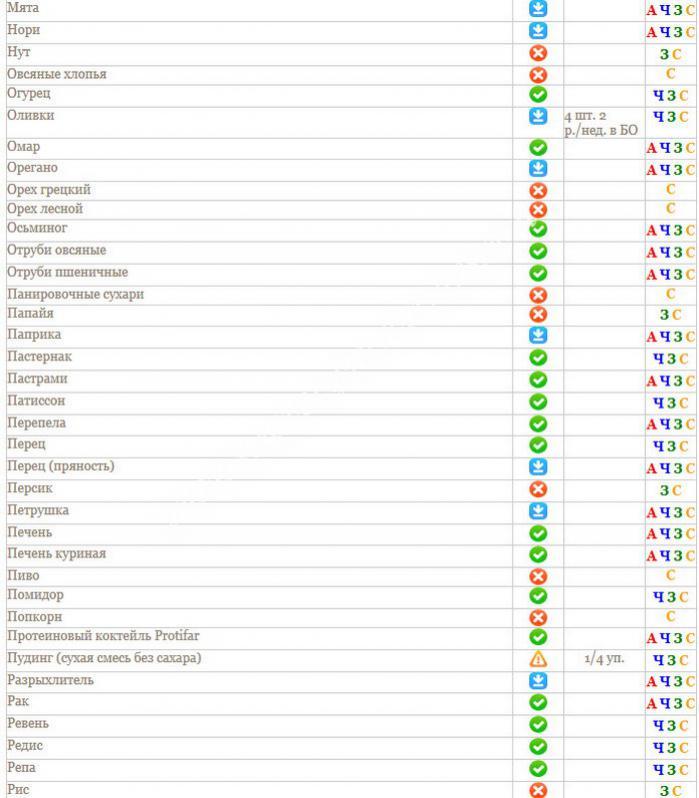 Постное мясо -говяжий стейк -говяжий язык -говяжье филе — говяжий антрекот — дичь — кролик — огузок — ростбиф — телятина — телячья печень — вяленая говядина — почки — говяжья вырезка Мясо птицы -куриная ветчина — индейка (без кожи и жира) -ветчина из индейки — куриная печень -курица (без кожи и жира) — печень цыпленка -куриные сердечки — перепел Рыба — барабулька — белый палтус/копченый палтус — большеголов — дорада — икра — камбала — кефаль — крабовое мясо/крабовые палочки — лосось/копченый лосось — макрель — мерланг — меч-рыба — морской окунь — морской лещ — морской язык — морской черт — налим — окунь — палтус — пикша — путассу — радужная форель — рыба -меч — сайда — сайра — сардина — скат — скумбрия -сардины — сельдь — треска — тунец — хек Морепродукты-большой краб -гребешки — кальмары — каракатица — краб — креветки — лангустина — лангуст — мидии — моллюски — морская улитка — морской еж — омар — ракушки — раки — устрицы Растительные белки -овсяные отруби — тофу Молочные продукты 0% жирности — зернистый обезжиренный творог — мягкий обезжиренный творожок — обезжиренное молоко — обезжиренный йогурт без добавок с подсластителем — обезжиренный плавленый сыр -обезжиренный творог Куриные яйца |