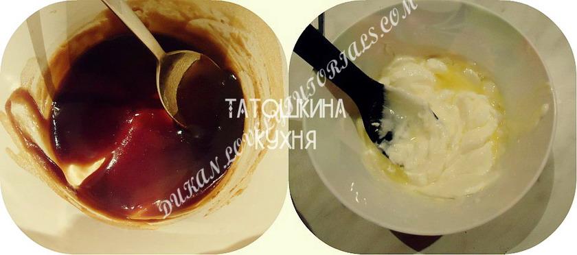Вложение 543 Очень вкусный торт по Дюкану! Немного хлопотный в исполнении, но он того стоит! Нежные бисквитные рулетики с сочным кофейным кремом, залитые вкусным суфле! Прекрасно подойдет для ваших праздников и торжеств. Пробуйте! Нормы НОРМА ДОПов на 1 ДЕНЬ Без ОТРУБЕЙ Ингредиенты Для бисквита: 6 яиц 2 ст.л. кукурузного крахмала 40 гр 2 ДОПа 1.5 ч.л. разрыхлителя щепотка соли сахарзам Крем для рулета: вы можете приготовить любой другой крем для рулета по желанию 2 ч.л. кофе растворимого 50 мл. кипятка 1,5 ч.л. агар-агара 100 г. мягкого обезжиренного творога 1 яйцо щепотка соли сахарзам Суфле: 100 мл. обезжиренного молока 0.5-1.5% 300 гр. мягкого обезжиренного творога 1 шт. натуральный йогурт ~ 150 г 25 г. желатина сахарзам любой аромик или ванилин на кончике ножа+1 ст.л. лимонного сока Пищевая ценность на 100 гр: 142.5Ккал 13.1Белки 7.9Жиры 5.4Углеводы Торт состоит их трех частей: 1. Рулет 2. Бисквит 3. Суфле Рулет и бисквит можно сделать заранее, но мы делаем все сразу, поэтому Готовить необходимо именно в такой последовательности в которой описано Торт по Дюкану Приготовление Для начала приготовим подходящую форму, в которой вы могли бы испечь бисквит, и в которую потом поместилось около 0.5 л суфле. Надо иметь в виду что форма нужна не маленькая У нас форма 25 см в диаметре и 6 см в высоту — подошла идеально по объему Перед началом приготовления замочим желатин в молоке для суфле И начнем приготовление с БИСКВИТА. Белки отделим от желтков. Белки взобьем с солью в очень крепкие пики (взбивать не менее 10 минут). Желтки соединим со всем остальным. Вложение 544Аккуратно вмешаем белки к желткам чтобы не опали. Разогреваем духовку до 180 С. В подходящую форму выливаем часть теста высотой примерно в 1 см. Выпекаем около 7 минут до готовности. Достаем из формы, остужаем на решетке. Вложение 545 Пока мы поставили печься бисквит займемся кремом. (именно в нижеприведенной последовательности) 1. Завариваем крепкий кофе из 2 ч.л. кофе и 50 мл. кипятка. 2. Отделяем белок от желтка. Желток соединяем с творогом и сахарзамом. 3. Белок взбиваем с щепоткой соли до крепких пиков. 4. Выливаем кофе в кастрюльку. Всыпаем агар-агар, на медленном огне доводим по кипения постоянно помешивая. Выключаем, снимаем с огня. 5. Быстро вмешиваем в кофейную смесь творог с желтком и белок. Должен получиться густой крем без комочков. Если Вы не успели вмешать все в кофейную смесь, она быстро загустеет и в креме будут комочки желе. В таком случае взбейте крем блендером, пока не исчезнут комочки. Но лучше этого не допускать :secret: Отправляем крем в холодильник. Вложение 546Вложение 547 Теперь займемся рулетом. Оставшееся у нас тесто мы выливаем ровным слоем на противень, выравниваем и отправляем в духовку при 180 С на 7-8 минут до готовности (не пересушите)! Готовое тесто отделяем от пергамента и переворачиваем, пока горячий сразу же смазываем нашим кофейным кремом и сворачиваем в рулет с помощью пергамента. Вложение 548 Рулет должен быть скручен очень плотно. Отправляем его охлаждаться в холодильник Вложение 549 Теперь финальный аккорд! СУФЛЕ! И получаем вкусный и легкий десертик, который тает во рту! Прекрасный торт по Дюкану!Взбиваем все ингредиенты до однородности. Набухший желатин нагреваем до растворения. Вливаем тонкой струйкой в творожную смесь и взбиваем около 5 минут , чтобы суфле было воздушным. Отправляем его охлаждаться в хол