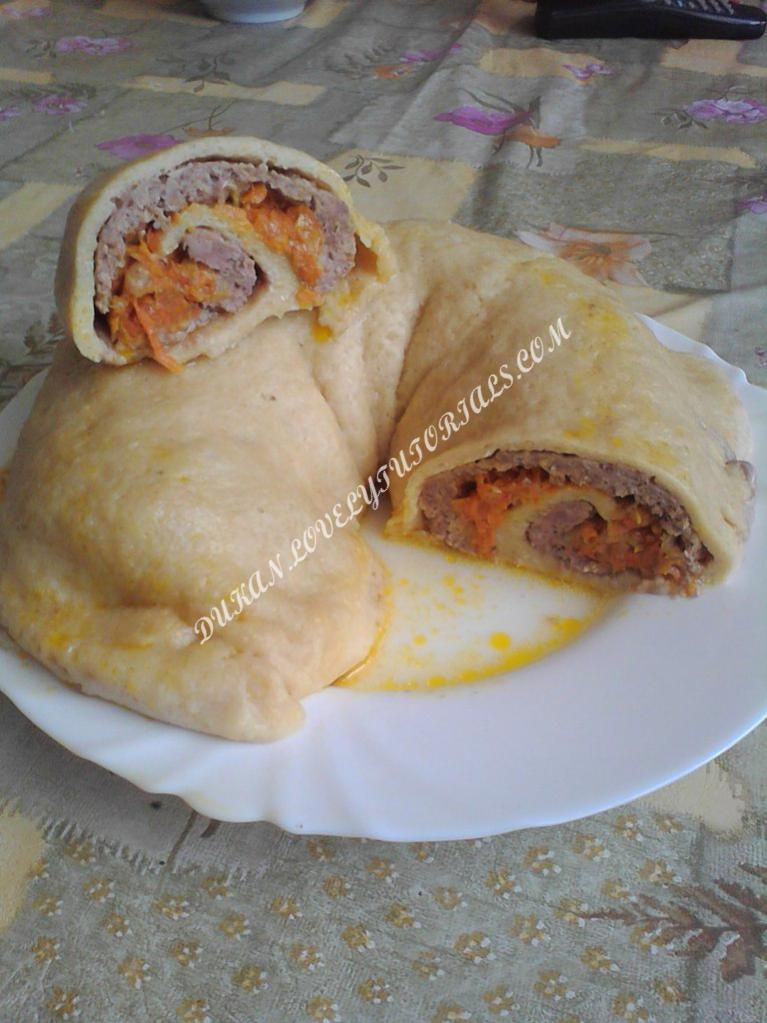 Вложение 576 Тесто Яйцо – 1 шт Молотые овсяные отруби – 2 ст.л. с верхом Клейковина – 2 ст.л. Соль – щепотка Сахзам – немного Разрыхлитель – 1 ч.л. Масло - 1 ч.л. Смешать творог, соль, сахзам и яйцо. В отдельной посуде смешать отруби, клейковину и разрыхлитель., добавить эту смесь к творожной и вымешивать рукой. Когда тесто начнет отставать от стенок посуды, можно выложить на стол и вымешивать тесто на столе (оно еще будет прилипать к столу, придется изредка собирать все ножом). Вымешивать тесто минут 20, пока оно не станет практически однородным, т.е. когда зернышки творога практически не исчезнут и тесто будет меньше прилипать к рукам. На крупную терку натираем 1 большую морковь и 1 большую головку лука мелко порезать, слегка об-жариваем в масле лук, затем добавляем морковь, чуть присаливаем и перчим, обжариваем овощную смесь. Даем овощам оствть и добавляем 60 г натертого сыра, перемешиваем. В 500 г мясного фарша добавляем специи,соль,можно чуть воды для сочности. Стол смочить водой и раскатать пленку в длинут45 см. Сверху пленку смазать маслом и раскатать наше тесто в прямоугольник. Выкладываем на тесто мясной фарш, на него овощной и сворачиваем плотно в рулет. А дальше на ваше усмотрение. Можно запечь в духовке, получится пирог. А можно выложить на смазанную маслом пароварку (как у меня) и варить 40 минут. Получается один большой пельмень или мант, но с кислинкой из-за теста, т.к. оно на твороге делается. Если добавить соду в тесто, кислинки не будет. |