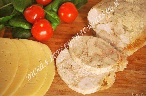 Вложение 610 1 кг куриного филе, 25 г. желатина, 2 зубчика чеснока, соль, паприка, чёрный молотый перец, сухие травы. Приготовление: Филе нарезать небольшими кусочками, чеснок натереть на мелкой тёрке. Все ингредиенты хорошо перемешать, выложить на пищевую плёнку и плотно замотать в несколько слоёв (7-10 для прочности), сформировав брусок. Положить в воду и варить 1 час. Слить воду и дать остыть до комнатной температуры. Убрать в холодильник полностью остыть и застыть. Приятного аппетита! |