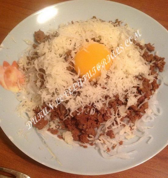 Вложение 672 Кладем на тарелку ширатаки, сверху кладем фарш, обжаренный с луком и ложкой томатной пасты, наверх желток, посыпаем сыром. |