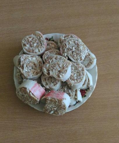 4 крабовые палочки опустить в кипяток на 30 секунд и развернуть. 1 банку сайры размять, добавить 4 зубчика чеснока, 2 столовые ложки обезжиренного творога, белки от 3 яиц натереть на мелкой тёрке. Все перемешать, намазать на палочки и свернуть рулетиком Автор-Татьяна Трегубенко |