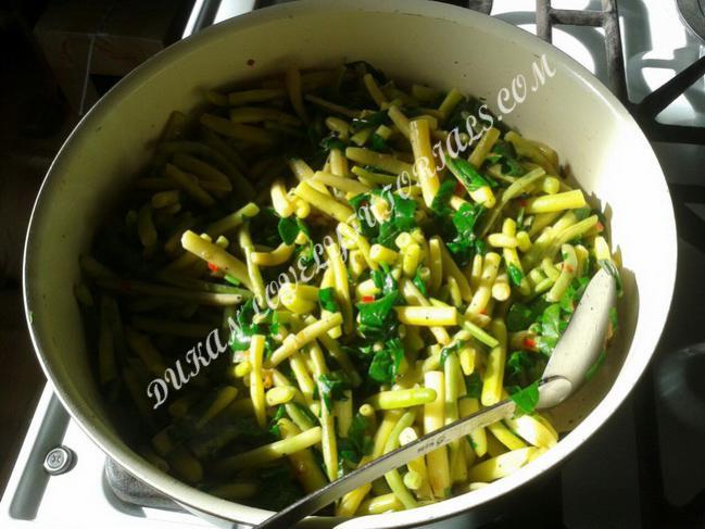 Вложение 854 Молодую стручковуя фасоль отварить 3-4 минуты, слить воду. Горький перец и репчатый лук нарубить и обжарить в ложке оливкового масла, добавить фасоль, слегка обжарить и добавить рубленный шпинат, еще подержать на огне, добавить специи и пряности по вкусу. Приятного аппетита! |