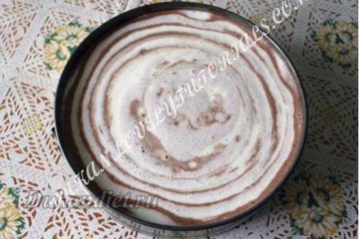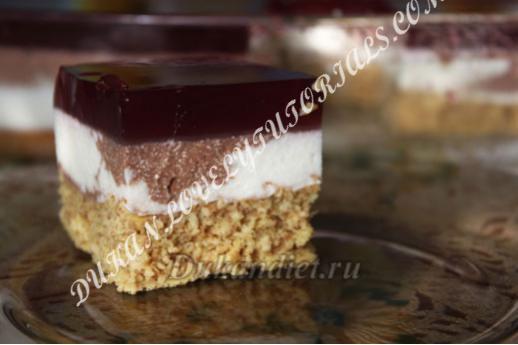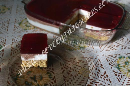 Вложение 903 Вложение 904 Вложение 905 Вложение 906 Вложение 907 Вложение 908 Вложение 909 Описание Тортик получается плотным, сладким и вообще от настоящего не отличишь! Тесто: 6 ст. л. овсяных отрубей, 2 ст. л. пшеничных отрубей. 10 г разрыхлителя для теста, корица (по вкусу), ванилин (по вкусу), 5-6 ст. л. жидкого творожка 0-1 %, 4 яйца, сах.зам жидкий (приблизительно = 50-100 г сахара). Творожный слой: (из 2 слоев - ванильного и шоколадного) 350 г зернистого творога (протертого через сито), 400 г кефира 0-1 %, сах.зам. жидкий (приблизительно = 200-250 г сахара), 50 г желатина, ванилин (по вкусу), 1 ст. л. какао. Желейный слой: 5 ч. л. каркаде, 750 мл кипятка, сах.зам. (приблизительно = 50 г сахара), 15-20 г желатина (лучше растворить его в горячей кипяченой воде (50 мл) сразу, а потом просто прогреть вместе с настоем не доводя до кипения). Замесить тесто: отруби смешать с ванилином, корицей, разрыхлителем, добавить творожок, яйца, сах.зам. Хорошо перемешать (можно миксером). Примечание: после того, как все ингредиенты смешаны, я даю тесту немного постоять (минут 5-10), это ему на пользу, как мне кажется. Залить в форму (по моему опыту - предпочтительнее выпекать в стеклянной форме!). Форму можно ничем не смазывать. Поставить в духовку и выпекать при t 180 градусов до образования румяной корочки. Достать из духовки и пока корж остывает, принимаемся за творожный слой. Итак, растворяем желатин в стакане горячей кипяченой воды, активно перемешивая-растирая. Оставляем немного остыть. Творог протираем через сито, можно 2 раза. Добавляем кефир, сах.зам. Смешиваем. Затем, добавляем в творожную массу пристывший желатин, перемешиваем миксером. Затем разливаем массу в две глубокие тарелки в равном количестве. В 1-ю тарелку добавляем ванилин, во 2-ю - какао (я предварительно развела какао кипятком, чтобы оно потом в готовом изделии на зубах не скрипело : ))) Теперь начинается самое интересное - смешивание! Начиная с ванильного, вливаем поочередно по 5 столовых ложек каждого "цвета" на остывший корж в форме. Вливаем в серединку, масса сама растечется как ей надо. Примерно так это должно выглядеть в конце. Ставим в холодильник - застывать. Пока творожный слой застывает, принимаемся за желейный слой. Делаем настой каркаде. Каждый по своему вкусу. Я люблю насыщенный, кисленький. Поэтому беру 5-6 ч. л. чая и настаиваю в 750 мл кипятка. После того, как настой готов, листья убираем (процеживаем), добавляем в чай сах.зам. и желатин, ставим на плиту и нагревая размешиваем настой, до полного растворения желатина. Внимание: до кипения не доводить! Лучше всего, нагревать настой на водяной бане. Как только желатин растворился, убираем настой с плиты и оставляем остужаться при комнатной температуре. Смотрите, чтобы он не застыл))) Когда настой остынет (будет уже еле тепленький), залить его сверху застывшего творожного слоя. Ставим в холодильник. Вот и всё! Осталось дождаться, когда желейный слой превратится в желе и можно кушать! Приятного! Несколько советов: 1. Не оставлять торт надолго в железной форме - творожный слой может окислиться. Если есть возможность, лучше сделайте торт в стеклянной форме. Если стеклянной формы нет, то лучше убрать железную боковую часть формы сразу же после застывания верхнего слоя торта, чтобы железо долго не соприкасалось с творогом. Основание формы можно оставить - с тестом ничего не случится. 2. Торта получается очень