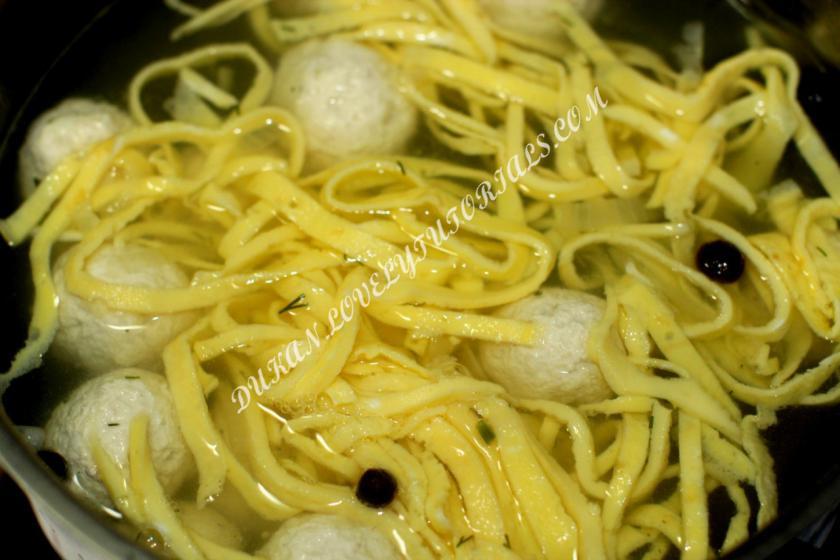 Вложение 937 Омлетная лапша: 1 большое яйцо 1 ст. л. молока 1 ч. л. к.крахмала (изолята для атаки) соль по вкусу Все смешать, испечь омлет, свернуть его рулетом и порезать, добавить к сваренному бульону из куриных фрикаделек с луком и специями. Фрикадельки из фарша (куриная грудка, куриные бедра и 1/2 маленькой луковицы) 1/2 маленькой луковицы для массовки в бульон, чуть укропа, специи. |