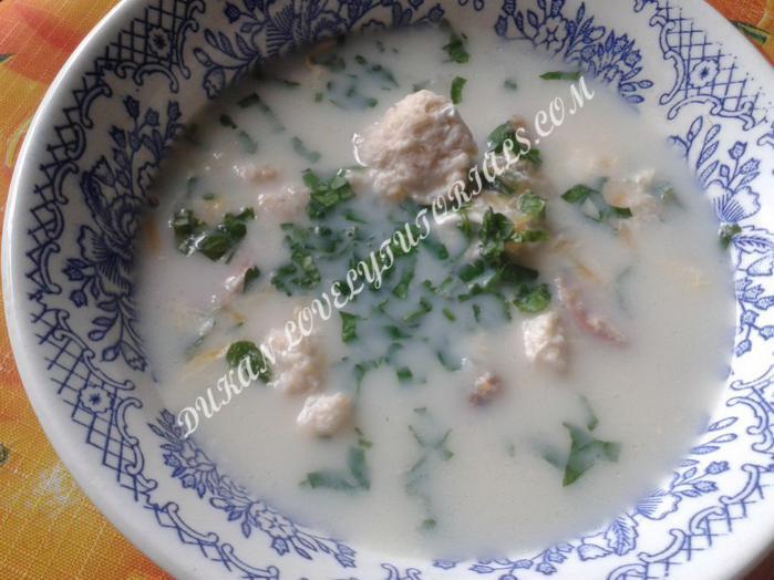 Вложение 1054 1 стакан молока 2 стакана воды половина копчёной курицы без кожи куриный фарш для тефтелей 1 ст.л. овсяных отрубей чеснок маленькая морковка луковица 2 яйца зелень соль, специи делаем тефтели: смешать в блендере фарш, чеснок, соль, один белок, овсяные отруби в кастрюле смешать молоко с водой в кипящий "бульон" добавить мелконарезанный лук, мелко тёртую морковь, чайной ложкой сформировать тефтельки и выложить их в кипяток варить минут 15 покрошиьь копчёную курицу не очень мелко, чтоб при приготовлении супа не развалилась, и в суп в тарелке вилкой взбить белок и 2 желтка, вылить в суп при постоянном помешивании, чтоб не получился один яичный блин солим и добавляем спиции по вкусу в конце кидаем зелень и даём прокипеть супчику 3 минуты всё |