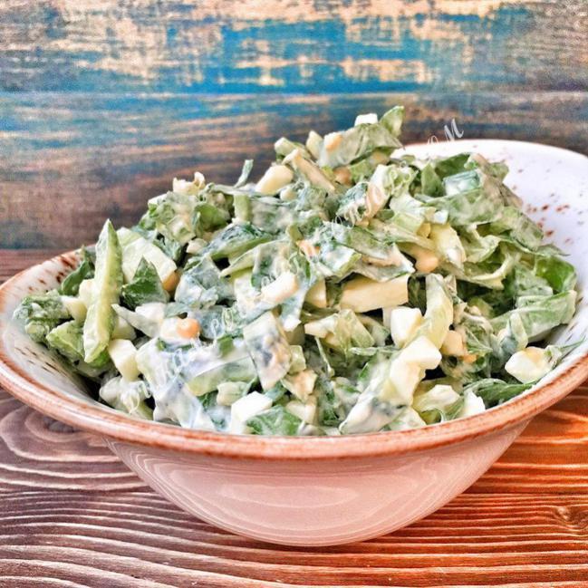 Вложение 1058 5 варёных яиц нарезать кубиками, сложить в миску, добавить 1 пучок мелко нарезанной молодой черемши, и 1 пучок щавеля, 2 свежих огурца, нарезанных соломкой, посолить и заправить 1 ложкой дюсметаны, перемешать, готово |