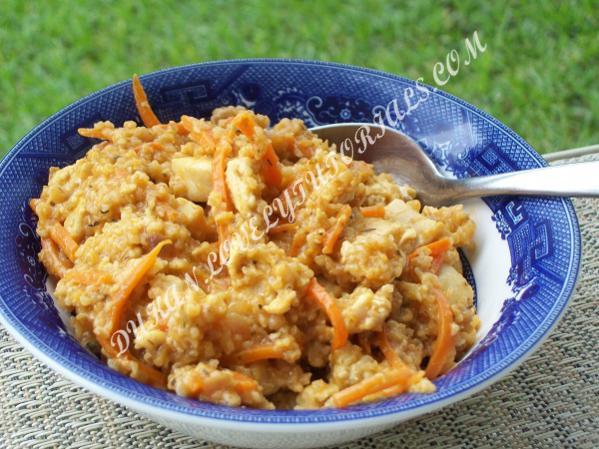 Вложение 247Вложение 248 Кашу можно есть на Атаке, НЕ ИСПОЛЬЗУЯ МОРКОВКУ, ОСТАЛЬНО ПО РЕЦЕПТУ. Итак, что нам нужно. на одну порцию - немного репчатого лука - морковь -2 ст. л. овсяных отрубей - мясо продукты ( у меня часть куриной грудки и немного фарша из индейки) - приправы Готовить на маленьком огне . - порезать лук, морковь, курицу на мелкие кусочки и положить в жаровню все вместе. Тушить около 10 минут, постоянно помешивая. В конце добавить соль, перец, чеснок ( у меня в порошке), и я еще добавляю по 1 ч.л. кетчупа, соуса для стейка и Вустерского соуса ( или соевого соуса). - Как мясо приготовится ,добавляем 2 ст. л. отрубей, добавляем кипятка примерно пол стакана, чем меньше воды, тем гуще. Варим до готовности отрубей, помешивая ложкой, примерно 5-7 минут на очень низком огне. - Далее выключить плитку, закрыть крышкой и дать настояться кашке хотя бы 5-7 минут, а потом наслаждаться вкусным и сытным блюдом. |