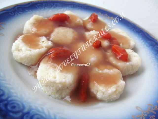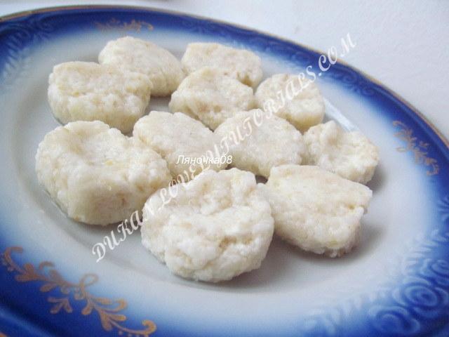 Вложение 254 Продукты Вложение 255 200 г творога (хорошо отжатого, без жидкости) 1 яйцо -взяла 1 белок 1 ст. ложка слегка размолотых овсяных отрубей -я взяла 2 ст.л. 1 ст. ложка пшеничных отрубей -не использовала 1-2 ст. ложки крахмала Приготовление: Автор советует для тех, кто не хочет/не любит отруби заменяйте их крахмалом. Но я стараюсь «вкусно» использовать отруби - да и 4 ст.л. крахмала- это на 2 дня делить надо. Творог с яйцом хорошо размешать, добавить отруби и ложку крахмала, перемешать. Если масса не будет хорошо лепиться добавьте еще крахмал. Тесто очень легкое,нежное, трудновато раскатывать..Можно добавить еще крахмала- но делать на 2 дня и половину замораживать http://ifs.cook-time.com/smiles/aiwan/std/good2.gif Хотя,в принципе порция из 200г творога довольно большая -у меня вышло 45 вроде вареничков- на 1 раз много- можно спокойно делить на 2 дня http://ifs.cook-time.com/smiles/aiwan/std/dance2.gif http://ifs.cook-time.com/smiles/aiwan/std/dance2.gif Раскатайте тесто как показано на фото и порежьте как больше нравиться. Вложение 256 Вложение 257 я потом еще сверху кусочки приплюскиваю -мне так нравится... Вложение 258 В кипящую воду осторожно опустите вареники. Варим минут 5 после всплытия на небольшом огне Вложение 259 Варенички нежные получаются..Я их потом выкладывала на сито-чтоб жидкость стекла Вложение 260 Когда остынут они стают более крепкие и держаться кучки http://ifs.cook-time.com/smiles/aiwan/she/girl_haha.gif http://ifs.cook-time.com/smiles/aiwan/std/wink.gif Выложите их в любую посудину и приготовить соус из йогурта -я ела с нежирной сметаной Вложение 261 полив соусом из ягод годжи Вложение 262 |