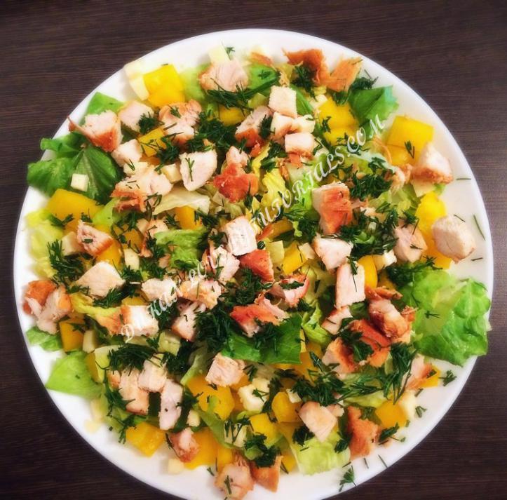 Вложение 1285 листья салата "Романо" половина пачки, 140 гр. куриного филе, запеченного в мультиварке, половина болгарского перца, 15 гр. сыра, оливковое масло. |