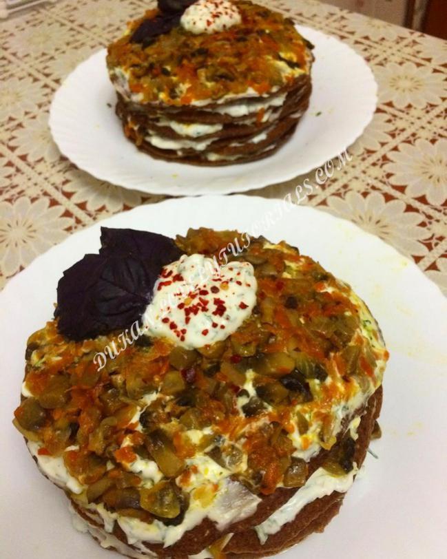 Вложение 1288 Рецепт : 500 гр куриной или говяжьей печени . 2 яйца 4 ст л овсяных отрубей 1 ст л кукурузного крахмала Соль , специи по вкусу . Печень измельчаем в блендере до жидкого состояния , добавляем все остальное и хорошо все перемешиваем миксером или венчиком ) Оставляем на 15-20 мин что бы отруби разбухли ! Теперь жарим без масла на антипригарной сковородке на медленном огне с двух сторон , лучше тоньше делать блины 👌🏻 Начинка : 1 большая морковь 500 гр грибов ( шампиньоны ) 2 средние луковицы . Все режем мелко , морковь через крупную тёрку . Жарим на 2 ст л масла . Соус : 500 гр мягкого творога ( я использую только Президент обезжиренный) 2-3 зубчика чеснока Любую зелень по вкусу ( у меня укроп кинза ) Соль и специи по вкусу . На фото из всех ингредиентов у меня вышло два тортика по 6 блинов и довольно много начинки 😜 Собираем торт и оставляем на 1-2 чтоб пропитался |