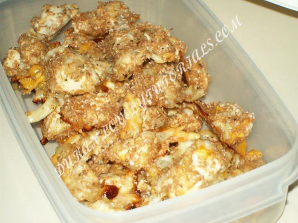 Вложение 315 У нас на сайте уже много рецептов классических наггетсов, а у меня адаптированный рецепт под диету Дюкан. Просмотрела несколько вариантов на дюкандиета и с несколькими изменениями пишу свой. - пара куриных грудок - 3-4 ст.л. отрубей ( овсяных или пшеничных. У меня были пшеничные) - сыр - кефир или йогурт - специи Разрешено на всех этапах кроме Атаки, т.к. присутствует сыр 2-5% жирности. Делаю маринад для курочки Смешиваем йогурт ( если густой, то добавляем пару ложек молока), добавляем специи ( у меня -чеснок в порошке, соль, перец, итальянские травы и Вустерский соус ( в оригинале без соуса). Режем куриные части на небольшие кусочки и смешиваем с соусом. Выглядит это вот так. Вложение 316 Отправляем нашу девушку-красавицу (т.е. курочку http://ifs.cook-time.com/smiles/aiwan/she/girl_haha.gif ) в холодильник на 30 минут, а можно и побольше. Далее достаем курочку, смешиваем отруби с тертым сыром, и обваливаем каждый кусочек в этой смеси. Кладем на смазанный лист и в духовку на 15 минут при темп. 180 С. Вложение 317 Достаем из духовки, наливаем молочка в кружку и наслаждаемся. Вложение 318 Вложение 319 |